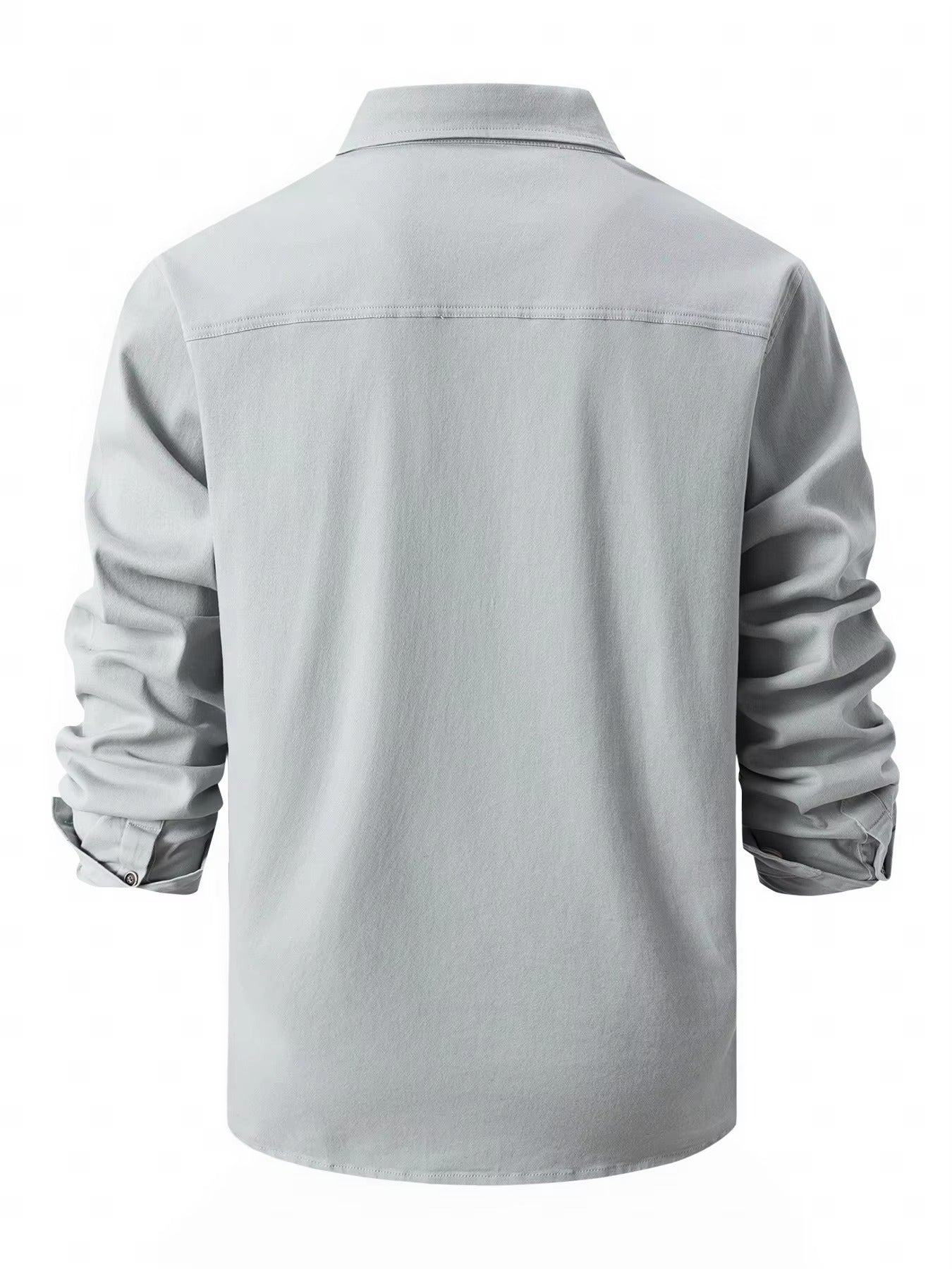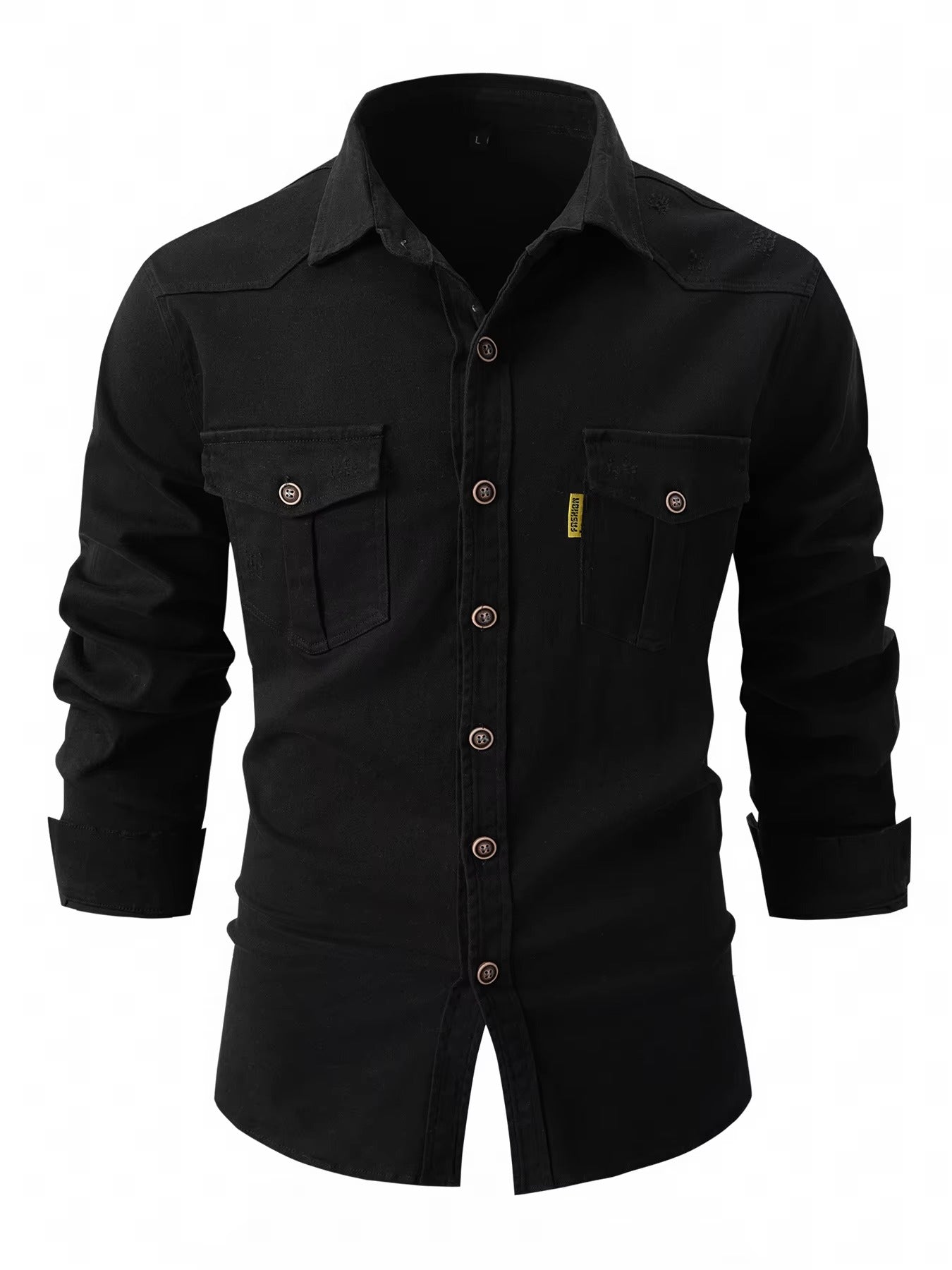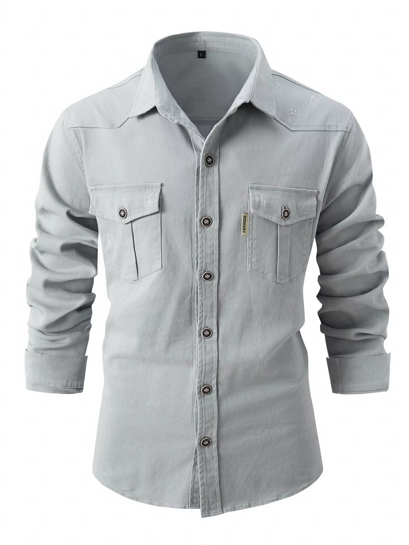 Questa camicia a maniche lunghe è realizzata in denim con tonalità contrastanti. Presenta un colletto classico e una chiusura centrale con bottoni, offrendo uno stile sia strutturato che disinvolto. Le tasche a pattina sul petto aggiungono una dimensione funzionale. La sua vestibilità pulita è adatta a una varietà di occasioni, dalla vita quotidiana a uscite più eleganti.