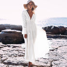 この白いロングドレスは、最適な快適さのために流れるような広いシルエットを提供します。深いVネックと刺繍のディテールが女性らしさを引き立てます。夏の夜にぴったりで、あらゆる場面に対応します。