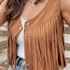 このノースリーブジャケットは、エレガントなフリンジと洗練されたボタンのディテールを備えています。時代を超えたデザインはさまざまなシーンに適応します。お気に入りのアウトフィットに重ね着するのに最適です。