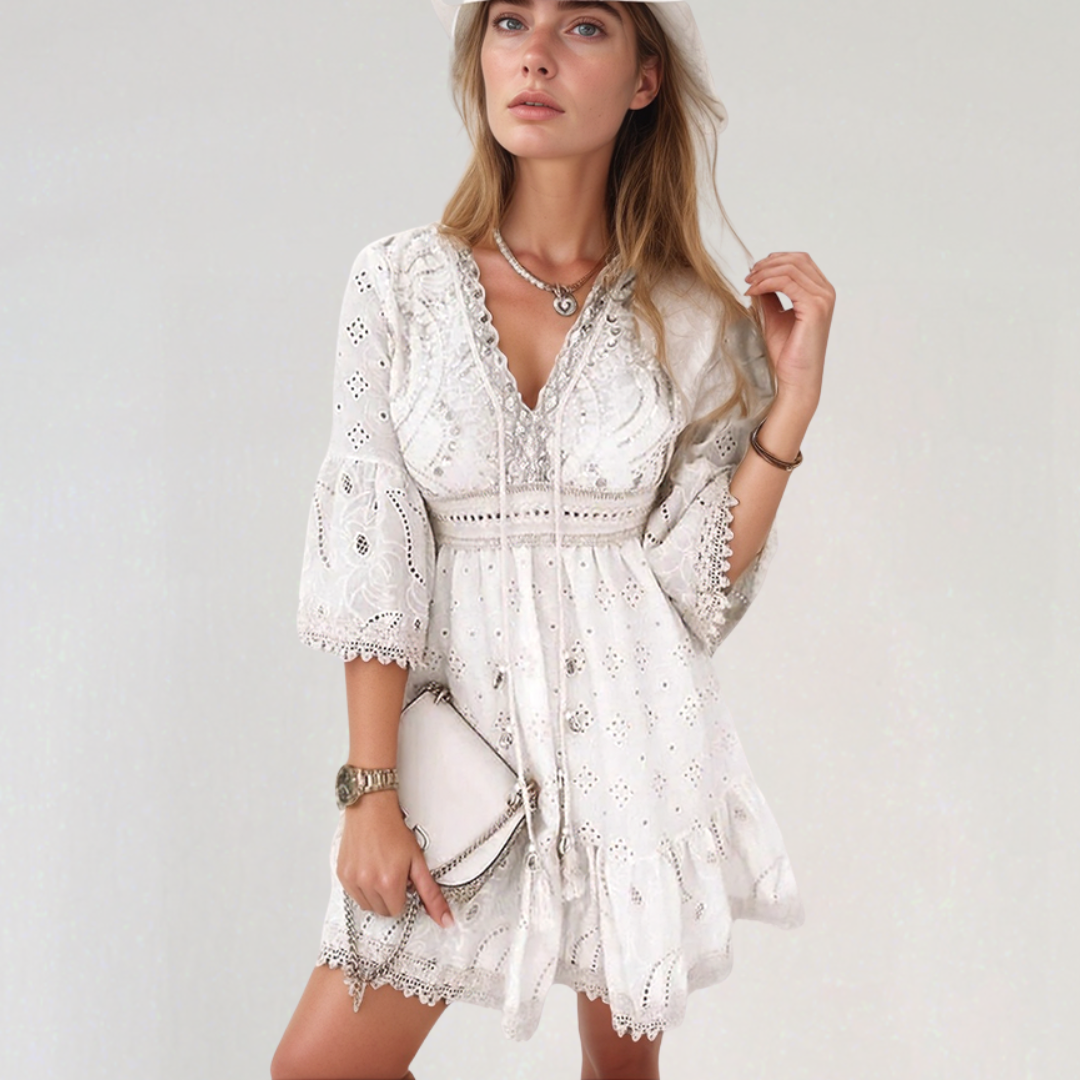 ジスレーヌ | ボヘミアンショートドレス – 繊細な刺繍とVネック
