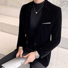 Denne slim-fit blazeren for menn kombinerer modernitet og selvsikkerhet. Den tettsittende snittet fremhever silhuetten samtidig som den gir en elegant stil, perfekt for store anledninger eller en vellykket urban stil. Båret med en rullekrage eller en skjorte, uttrykker den en selvsikker tilstedeværelse og en sikker smak for sofistikering.