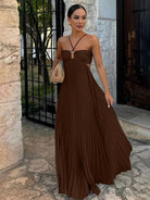 Denne lange, ermeless kjolen har et plisserte bustierdesign med halterneck og kryssrygg. Perfekt for varme dager, den kombinerer komfort og stil. Dens uformelle utseende gjør den til et ideelt valg for ulike sommeranledninger.