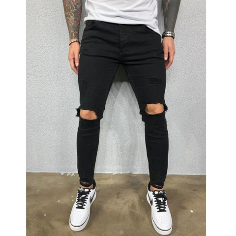Deze gescheurde broek heeft een moderne en slim fit snit. Verkrijgbaar in blauw en zwart, past hij gemakkelijk bij al uw outfits. Perfect voor een casual en trendy look.