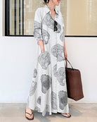 Ta długa sukienka koszulowa zachwyca swoim swobodnym krojem i artystycznym akcentem. Jej strukturalny i oryginalny design pasuje zarówno na relaksujące dni, jak i na bardziej eleganckie wyjścia. Długie rękawy i kołnierz koszulowy nadają temu modelowi zdecydowanie luźny, ale elegancki charakter.